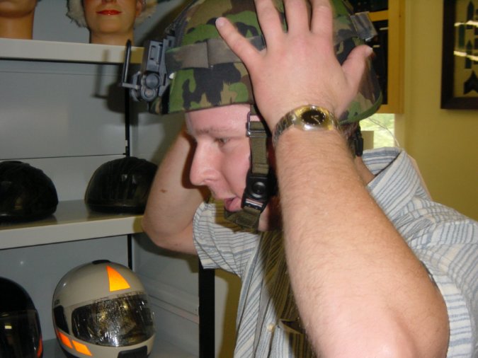 Bis zu den Lampen ist es auf dem Areal des AMP und Ruag Thun ein weiter Weg. Unterwegs musste/durfte zumindest von einem von uns der allerneuste Keflar-Helm gleich probegetragen werden.