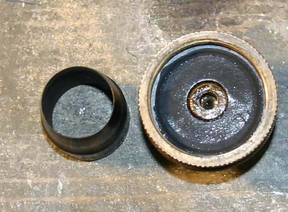 Als ich die Lampe bekam mussten alle Dichtungen gewechselt werden. Ohne das entsprechend grosse Locheisen ist da nichts zu wollen! Satte 33mm Aussendurchmesser hat die Tankverschlussdichtung. Ein Bild der montierten Dichtung mit einem 20 Stanzwerkzeug nebenan als Vergleich.