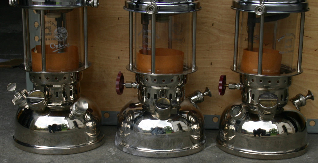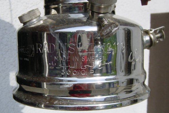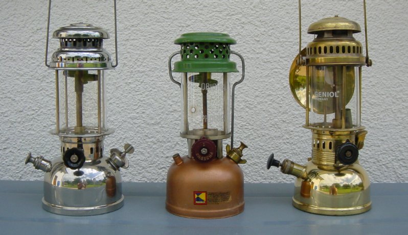 Die älteste Lampe die ich habe (ausser Hängelampen), ist die Primus 981 (Petrol). Sie hat die Markierung AD und stammt somit aus dem Jahre 1939. Mit dieser Lampe habe ich dann eine Optimus 200P (Petrol), eine Radius 119 (Army) (Petrol) und eben die Primus 981. Der Schwedische Stil ist bei den beiden letzteren Lampen gut zu erkennen.