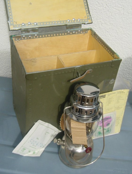 Sie ist mit 4 Sturmlanternen, Kanister und Kleinteilen zusammen in einer Holzkiste die vom Oesterreichischen Heer stammt.