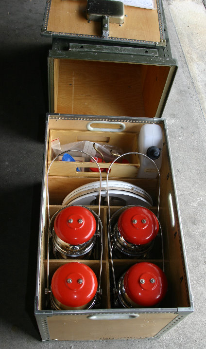 In den Kisten der Schweizer Armee befinden sich auch Klapplanternen die zusammenlegbar sind und als Lichtquelle für das Inbetriebsetzen der PM gedacht sind.