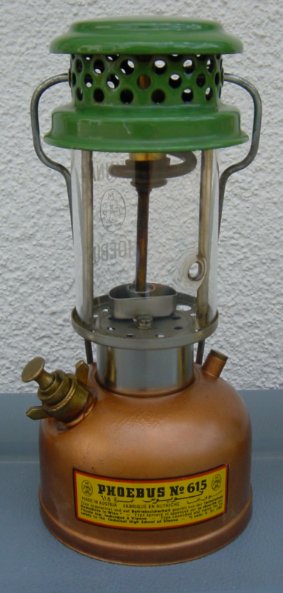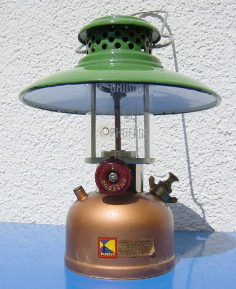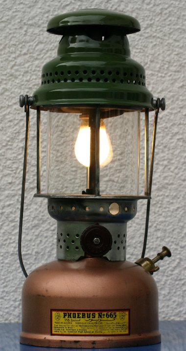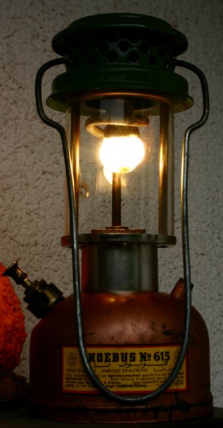 Noch eine Phoebus 615 für den alltäglichen Gebrauch. Sie ist wirklich sehr klein und auch der Glühstrumpf hat gerade so Platz. Solange der Glühstrumpf nicht abgebrannt ist, berührt er nicht nur den Vergaser, sondern sogar noch das Glas, so eng ist es da drinn.
