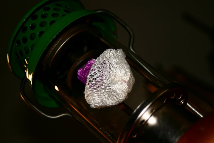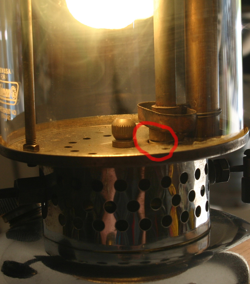 Doch noch immer brennt sie nach ca. 2 Stunden auf einmal ausserhalb des Glühstrumpfes. Wiederum war die mangelhafte Wärmeentwicklung schuld. Es dauerte ein paar dieser zweistunden Zyklen, bis ich herausfand, dass der Tankverschluss nicht ganz dicht war und deshalb die Lampe mit zu wenig Druck wiederum sehr empfindlich reagiert. Sie erzeugte wiederum zuwenig Wärme, was das Petrol dann wieder nicht völlig zum verdampfen brachte. Eine neue Tankverschlussdichtung (18x10x1) schaffte abhilfe. Da ich keine 300'er Opitmus Düse besitze vermutete ich zuerst dort das Problem, doch dies lies sich mit einer 250'er Petromaxdüse zu lösen. Eine 350'er Petromaxdüse erzeugt innert ca. 15 Minuten ein Glühendes Mischrohr und somit ebenfalls eine immer dunkler werdende Lampe.