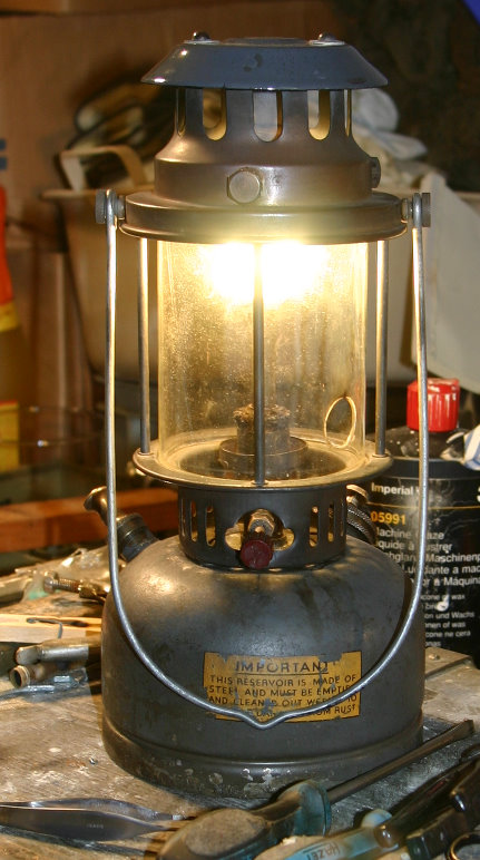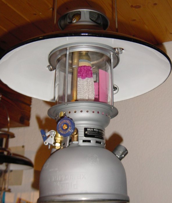 Ausser einer neuen Tankverschlussdichtung (die alte war aus Leder), zwei Glühstrümpfe, Benzin und dem Nachziehen des Vergaser bedurfte es keinen weiteren Arbeiten um die Lampe zum leuchten zu erwecken.