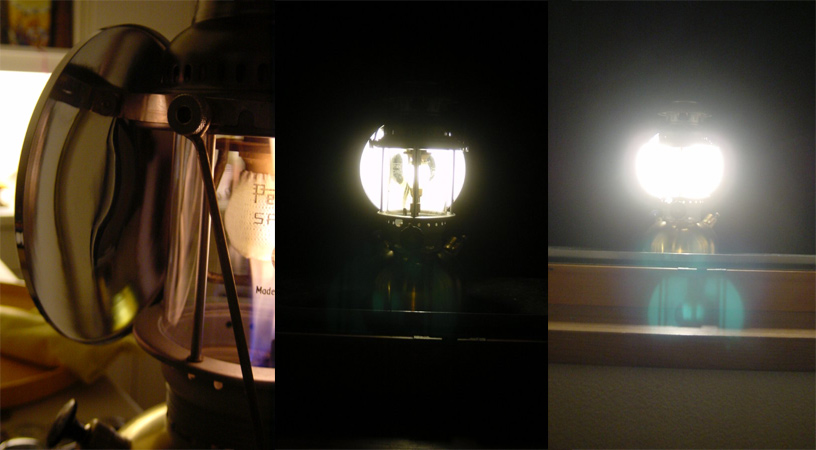 Der Original Petromax Seitenreflektor (hier an einer Schweizer 250'er PM) erweist sich als richtiger Parabolspiegel und der Lichtkegel kann mit der Tilley AL21 durchausverglichen werden.