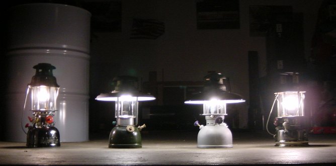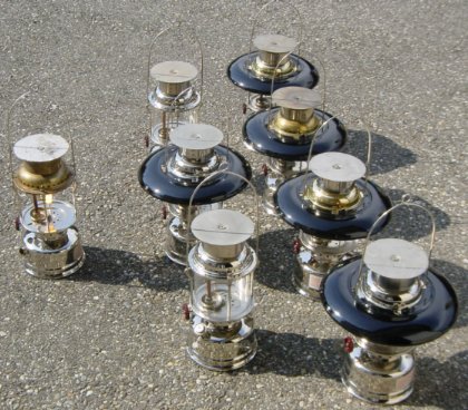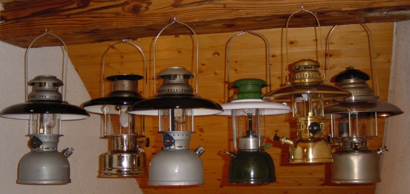 Hier die Lampen die bei mir im Moment in Betrieb stehen...das Quartet...(von links nach rechts, Anchor 500, Bialaddin 305, Petromax 523/821/250, Radius 119 Army)