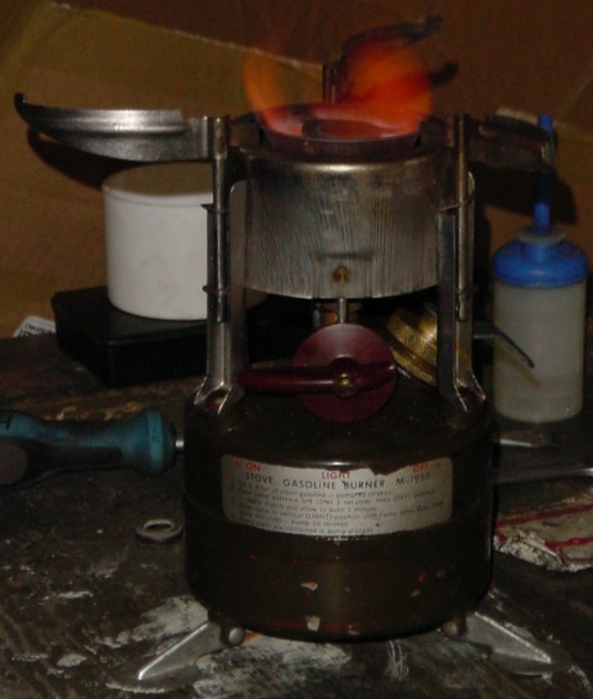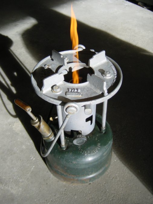 Klein und handlich ist der Optimus 80 mit Blechdose der mit Benzin betrieben wird.