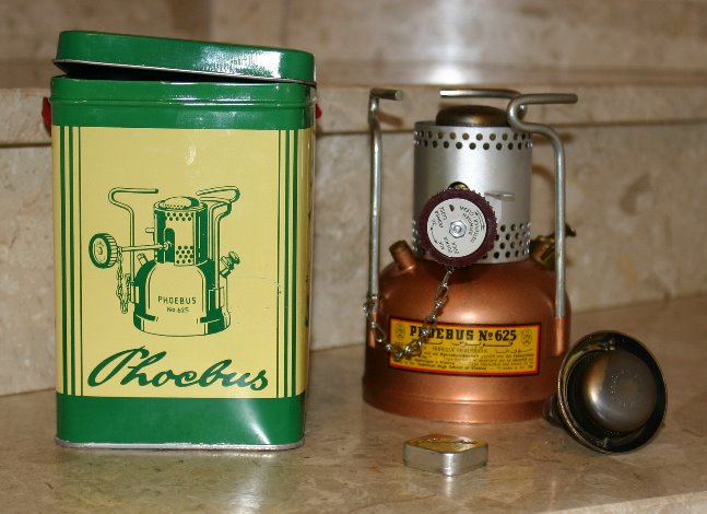 Phoebus 625. Es fehlen die Topfstützen, verlängerte Pumpe und Handrad, weil der Kocher so für die Deutsche Bundeswehr umgebaut wurde. Es handel sich um ein sehr zuverlässiges Gerät bei grosser Heizleistung und kleiner Bauweise.